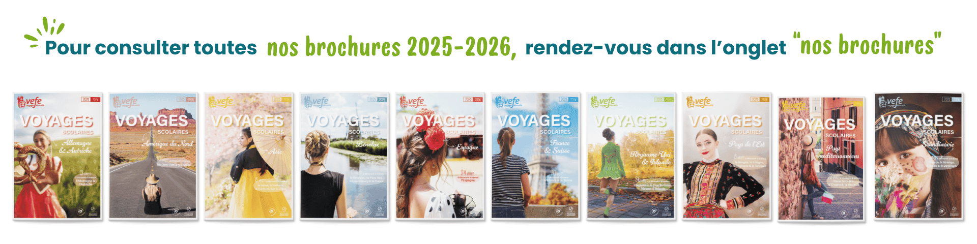 A l'écoute de vos projets, vos besoins, vos envies, notre équipe de professionnels passionnés met toute sa disponibilité et son savoir-faire à votre service. Chaque année, ce sont environ 50 000 collégiens et lycéens accompagnés de leurs professeurs qui voyagent avec VEFE Voyages Educatifs dans le respect des règles de sécurité. Un grand MERCI pour la confiance que vous nous accordez et que vous nous renouvelez depuis 1990 !