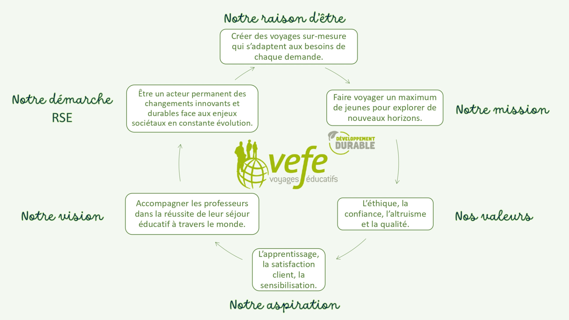Par son professionnalisme, son organisation sérieuse et efficace, VEFE est un maillon important dans la transmission des valeurs sur le développement durable et répond parfaitement à ces objectifs pour que le voyage scolaire reste un moment inoubliable pour les élèves et les professeurs.